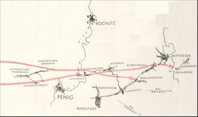 WITH the regimental CP moved up to Claussnitz, the troops dug in along a defense line approximating the course of the Zschopau. The sector at first held alone by 2nd battalion was now shared with the 1st battalion, while 3rd battalion guarded warehouses, supply dumps and ammunition trains at Burgstddt, the division CP. For several days a state of readiness was maintained to repulse the expected counter-attack. |
