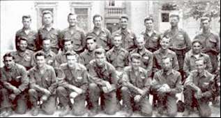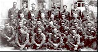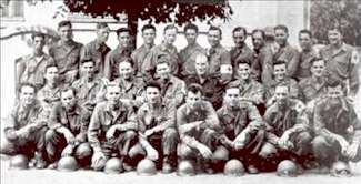 1st Row: Pfc. James Barboya, Pfc. Murl Bland, 1st Sgt. Robert Mahan, 2ndLt. Donald Young, Pfc. Allan Vikjord, T/5 Oscar Tate, T/4 Ray Scott; 2nd Row: T/5 Reginald Banus, Pfc. William Whitley, Pfc. Tom Romo, Pfc. Oakley Teeter, Pfc. James Hostetler, Cpl. Ray McQueeney, Pfc. George Nagel, 1st Sgt. Edward Giglio; 3rd Row: S/Sgt. Eugene Lauver, T/Sgt. Edward Piekut, Pfc. David Lofgren, Sgt. Louis Hardina, Pfc. Donald Berry, Sgt. Wallace Hoim, Pfc. Darwin Arrola, T/5 James Rowell.